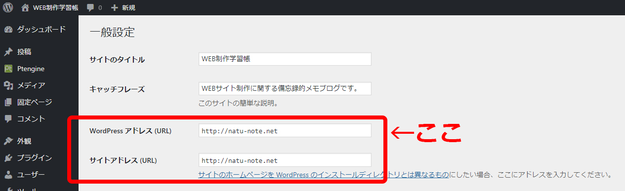 とりあえず管理画面は開ける状態だったので「設定」「一般」の「WordPress アドレス (URL)」と「サイトアドレス (URL)」を独自ドメインに変更。